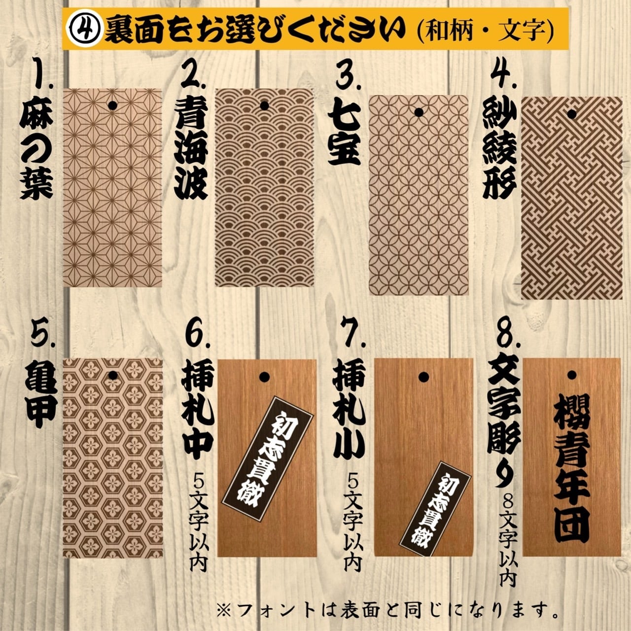 【完全オーダーメイド制】 お好きな名前や文字はもちろん、フォント/デザイン/背景柄/彫り方/紐色をカスタマイズ可能なので、世界に一つだけのオリジナル木札をお作りいただけます。
