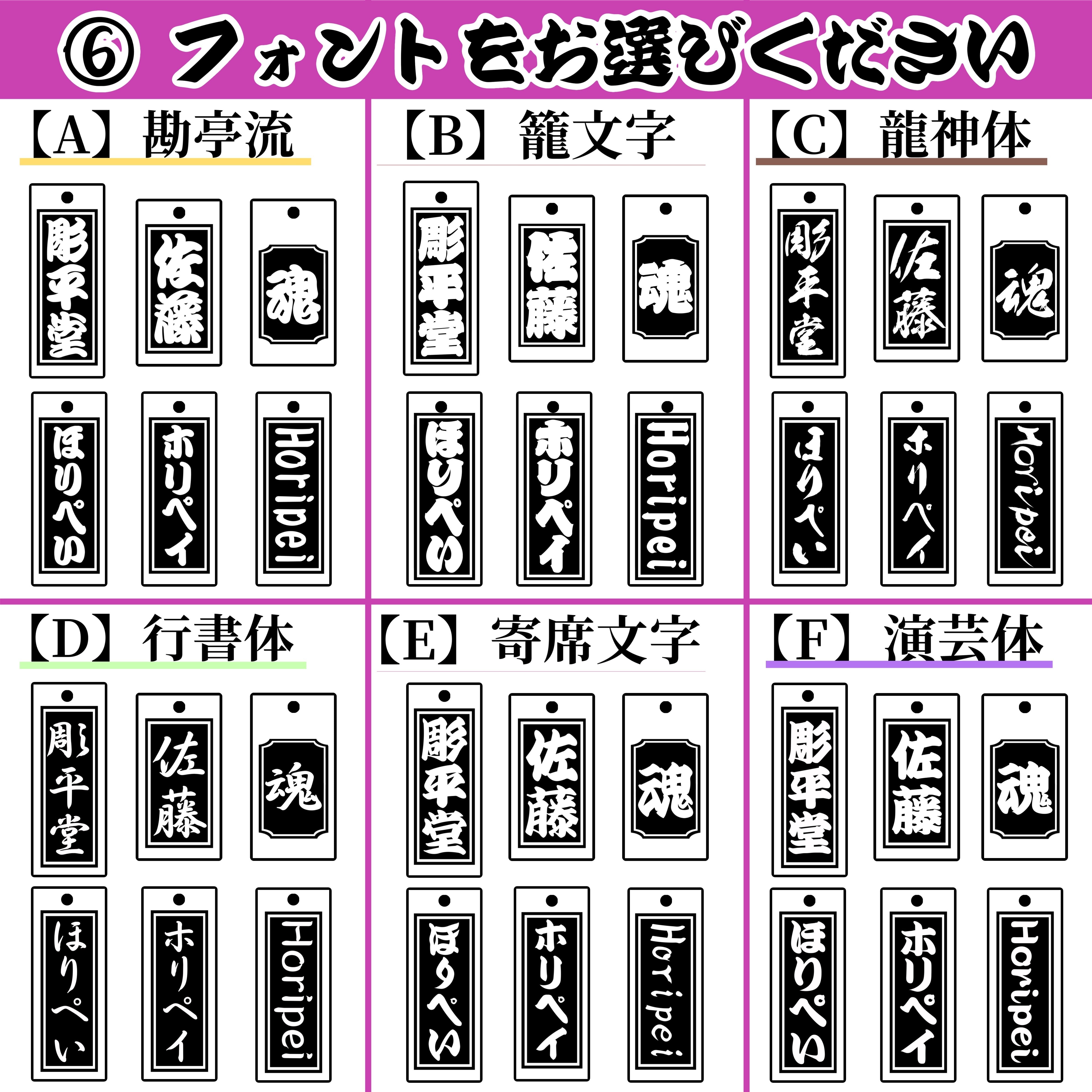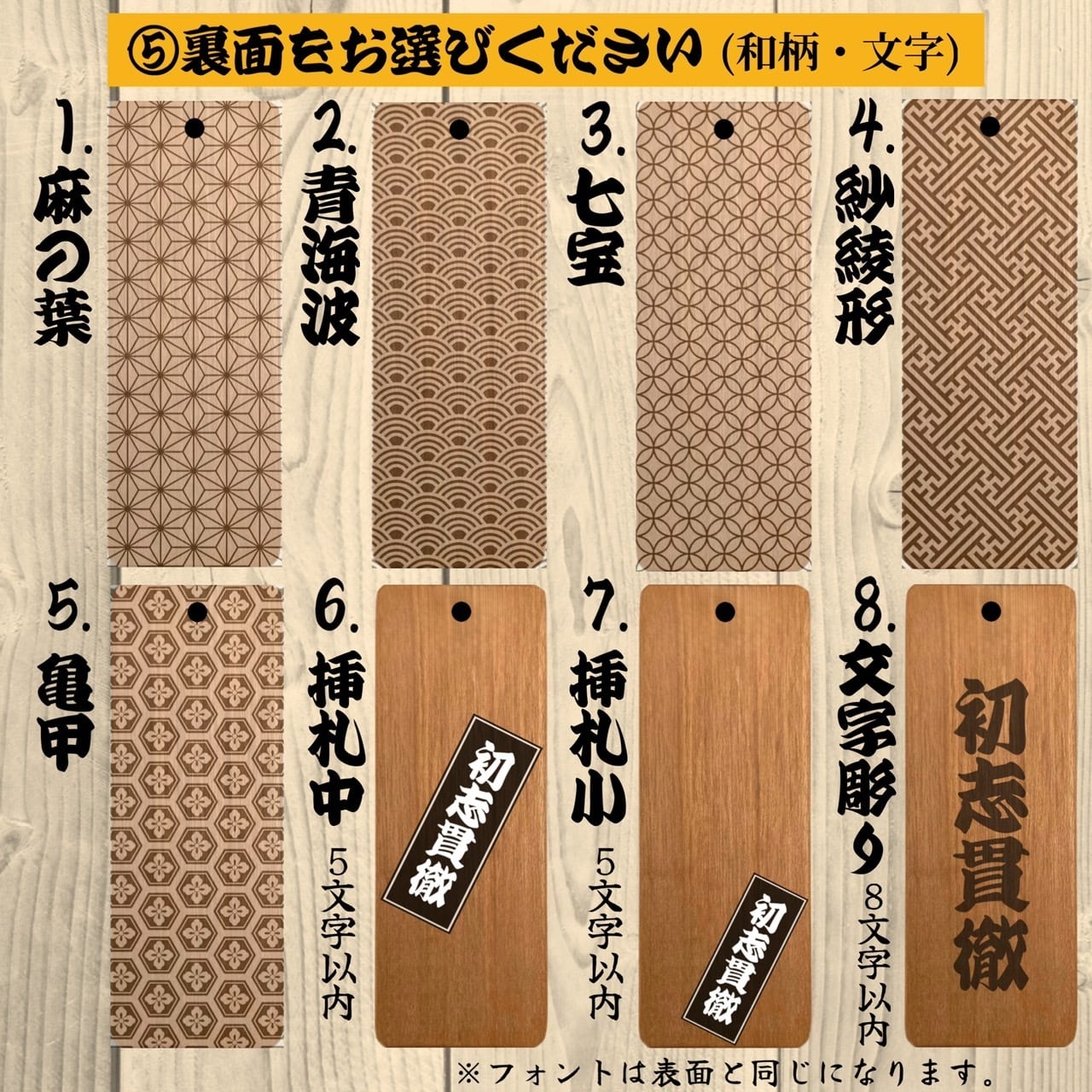 【完全オーダーメイド制】 お好きな名前や文字はもちろん、フォント/デザイン/背景柄/彫り方/紐色をカスタマイズ可能なので、世界に一つだけのオリジナル木札をお作りいただけます。